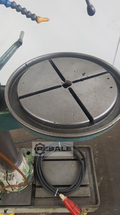 Specifications: - Drilling capacity in steel ST 60 28 mm - Drilling capacity in steel ST 60 32 mm - Drilling spindle holder MK 3 long spindle - Drilling spindle stroke 180 mm - Drilling spindle speeds infinitely variable approx. 140 - 1600 rpm - 3 feeds 0.1 ; 0,2 ; 0.3 mm/U - Projection 290 mm - max distance table - drilling spindle 620 mm - Rotary table with 2 T-slots 450 mm - Height adjustable via rack and pinion with hand crank - Coolant device - Drive 380 V / 0.9 / 1.3 kW - Space requirement approx. W 750 x H 1900 x D 700 mm - Weight approx. 280 kg