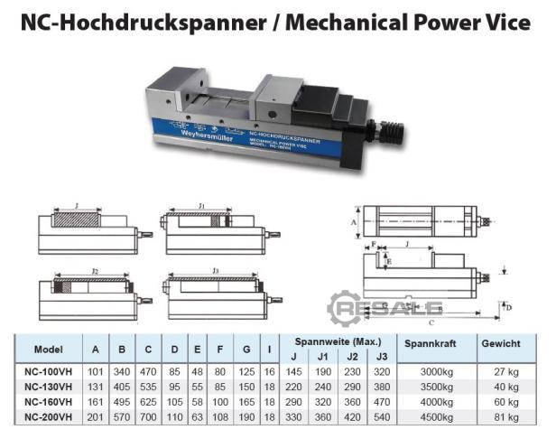 Machine vise ATS NC-130VH Jaw width: 130 mm Jaw height: 55 mm Max. internal wingspan: 220 mm Max. wingspan outside: 380 mm with pull-down function Clamping force : 35kN Weight: 40 kg Delivery possible