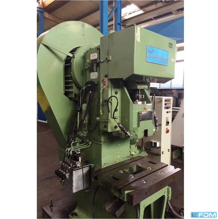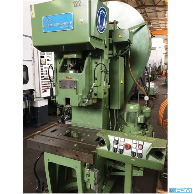 A single-column eccentric press Edelhoff including transfer unit is available. Press force: 130t, stroke adjustment: 30mm-130mm, ram adjustment: 75mm, stroke rate: 45/min, table dimensions X/Y: 1000mm/700mm, weight: approx. 5000kg. An on-site inspection is possible.