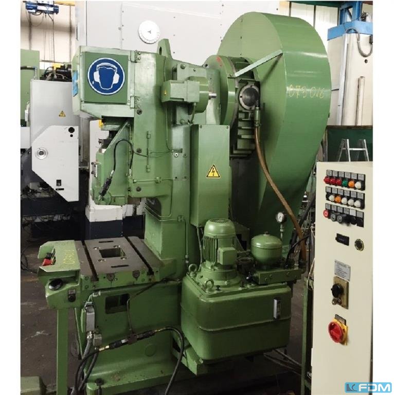 Pressure:063 t throat:250 mm stroke:10 - 100 mm no. of strokes:120 /min distance table/ram, max. stroke up, adjustment up:380 mm table surface area:700 x 500 mm hole in the table:180 x 140 mm table height over floor:700 mm ram surface:360 x 275 mm ram adjustment:60 mm power requirement:5,5 kW weight:3,8 t Dimensions (WxDxH):1,9 x 1,7 x 2,4 m German Safety: permitted for manual loading:UVV 11.062 - VBG 7n5.1 clutch-/ brake combination:hydraulic overload protection in ram:mechanical