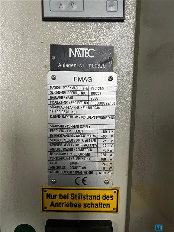 Manufacturer: EMAG Model: VL 3 mLT Year of Manufacture: 2004 Type of Machine: Vertical Turning Lathe Data of VL3: - Lifetool available for powered tools - Interface for automation - additional inputs and outputs / M-functions - Shuttle operation - Machine was never driven wet (always dry) Electrical Specifications: - Working Voltage: 400/480 V - Control Voltage (General and Valves): 24 VDC - Frequency: 50/60 Hz - Current Supply: 3 AC - Rated Power: 31 kW - Rated Current: 48.40 A - Supply Fuse: 50 A Physical Specifications: - Total Weight: 5500 kg Find more here - / Contact us at -