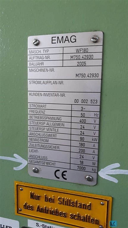 Inv. Num. : 7575 Type: VL7 Produzent: Emag Erzeugt: 2010, GO 2012 Parametern: Steuerungssystem: Fanuc 32i TB Max. Drehdurchmesser: 420 mm Maximale Drehzahl der Spindel: 3400 1/min Verfahrwege X: 850 mm Verfahrwege Z: 315 mm Spannfuttergröße: 400 Länge: 5250 mm Breite: 3500 mm Höhe: 3500 mm Gewicht: 9000 kg Ausstattung: Kühlung Späneförderer Angetriebene Werkzeuge Messsonde