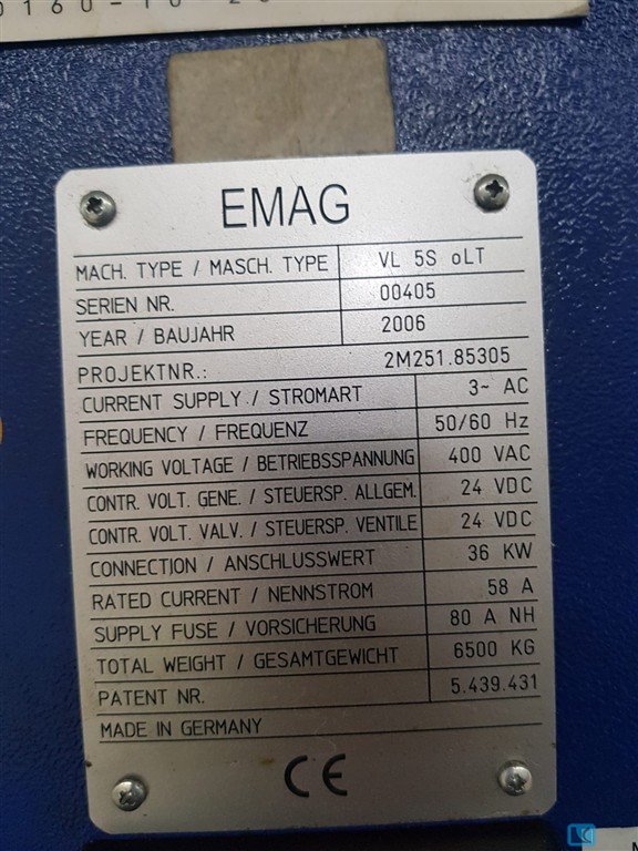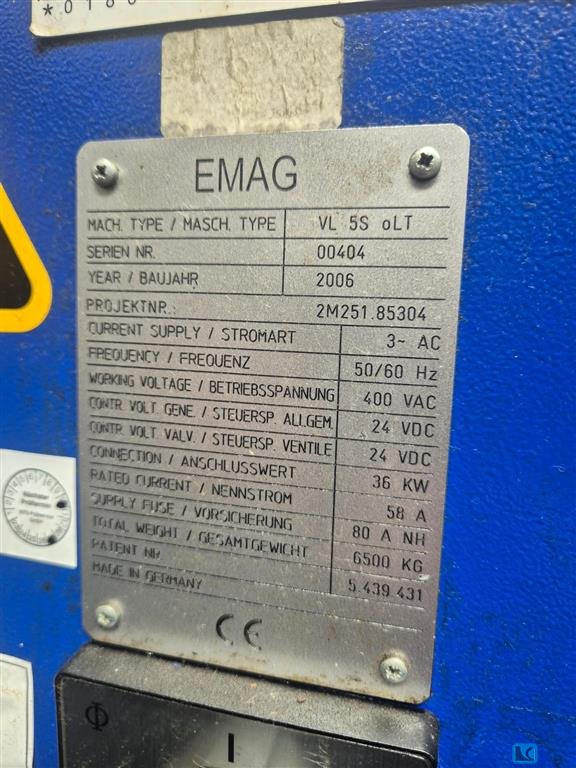 Manufacturer: EMAG Model: VL 3 HW mLLT Year of Manufacture: 2008 Data of VL3: - Lifetool available for powered tools - Interface for automation - additional inputs and outputs / M-functions - Shuttle operation - Machine was never driven wet (always dry) Electrical Specifications: Current Supply: 3 AC Frequency: 50/60 Hz Working Voltage: 400/480 V Control Voltage - General: 24 VDC Control Voltage - Valves: 24 VDC Connection Value: 38 kW Rated Current: 58 A Supply Fuse: 80 A Physical Specifications: Total Weight: 5500 kg Find more here - / Contact us at -