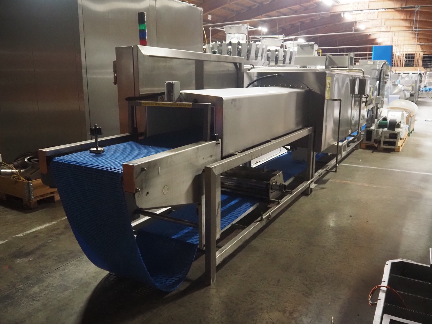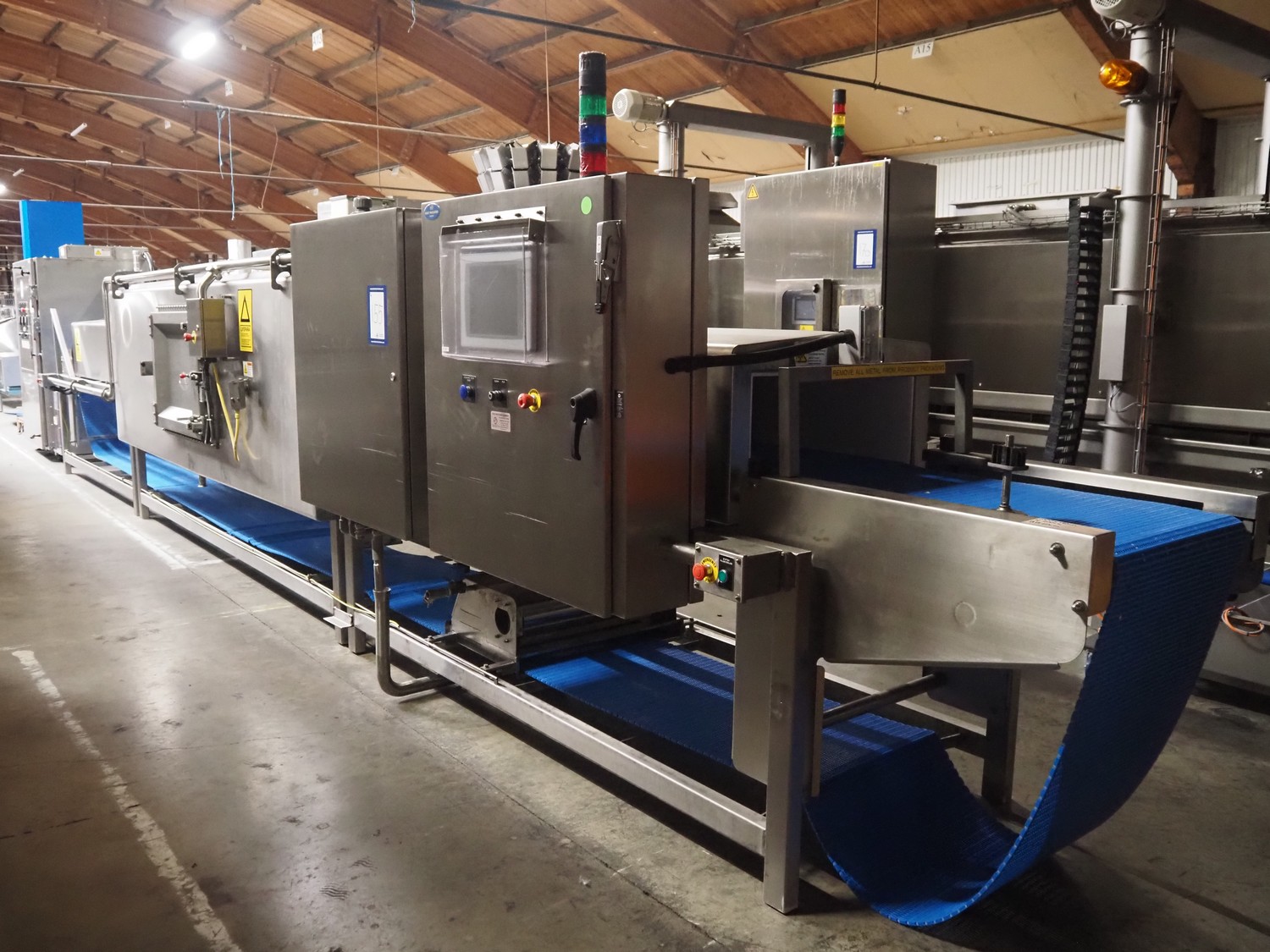 Carnitech industrial microwave, type: Thawing, identification number: 08-0050, year of construction: 2007, 400 V, 3 Ph, 2x 75 kW, plastic belt, belt width: 460 mm, total dimensions microwave: 11150 mm x 1750 mm x 2660 mm. Including s/s cabinet with Grundfoss pump, dimensions cabinet: 1320 mm x 700 mm x 1920 mm. Galvanized shed with electrical cabinets, dimensions shed: 3380 mm x 4200 mm x 3650 mm.