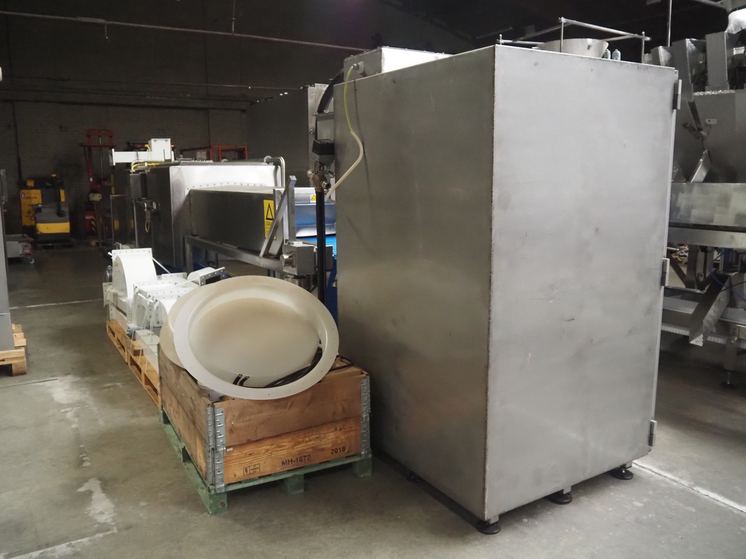 AMTek microwave, model: AMT7510U, serial number: AO439, year of construction: September 2010, 400 V, 3 Ph, 50 Hz, 150 A, 75 kW, microwave frequency: 896 MHz, maximum voltage inside: 20.000 V, working hours: 61041 hour, plastic mesh belt, belt width: 610 mm, clearance: 650 mm x 280 mm, total dimensions: 9850 mm x 1600 mm x 2300 mm. Including transmitter cabinet, dimensions: 1600 mm x 1120 mm x 2100 mm and 2 pallet with parts.