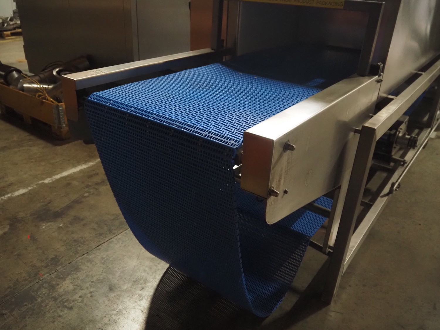 Serap shock freezing tunnel, type: CRUST FLOW P, number: P95.05, year of construction: 1997 (revised in 2020), 400 V, 3 Ph, 50 Hz, 1 kW, weight: 1300 kg, plastic belt, belt width: 450 mm, clearance: 440 mm x 110 mm, total dimensions: 4300 mm x 1200 mm x 1700 mm. Including s/s switch cabinet, dimensions: 1000 mm x 920 mm x 1600 mm.
