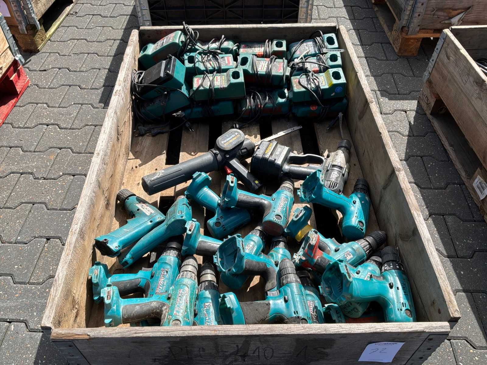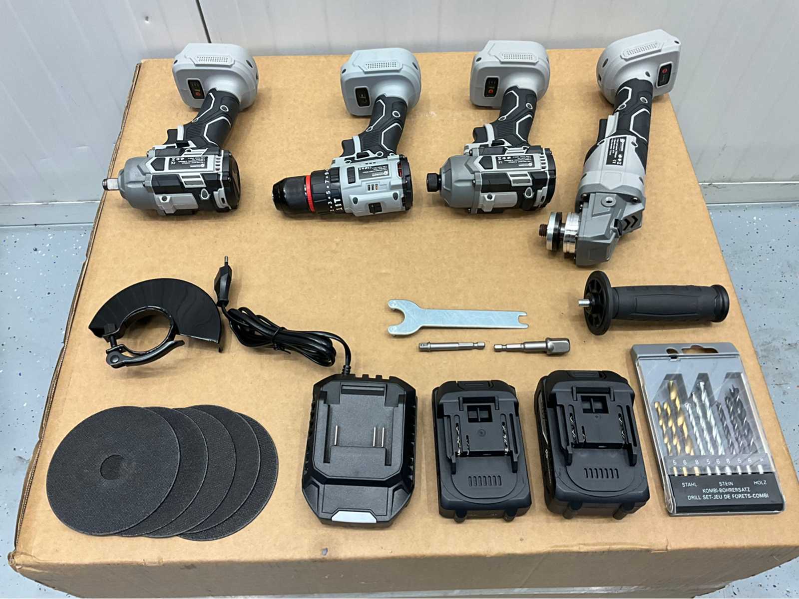 - screwdriver - Drilling machine - Impact wrench - angle grinder 1x Li-ion Battery Charger 1x Li-ion Battery 20V 2Ah 1x Li-ion Battery 20V 4Ah 5x Cutting disc 1x Drill set 9 Pcs 1x 1/4\" 65mm ADA 1x 1/2\"73mm ADA 1x Key Chuck Angle Grinder unused Auction-ID: A1-40237-119