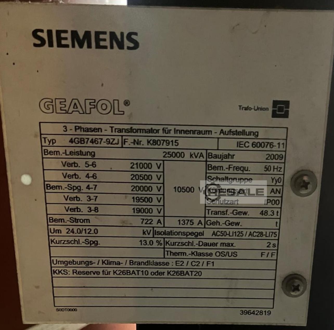 | SIEMENS | 2500 KVA 10KV-400V 50Hz | 19900 EUR | [May 2021] | |