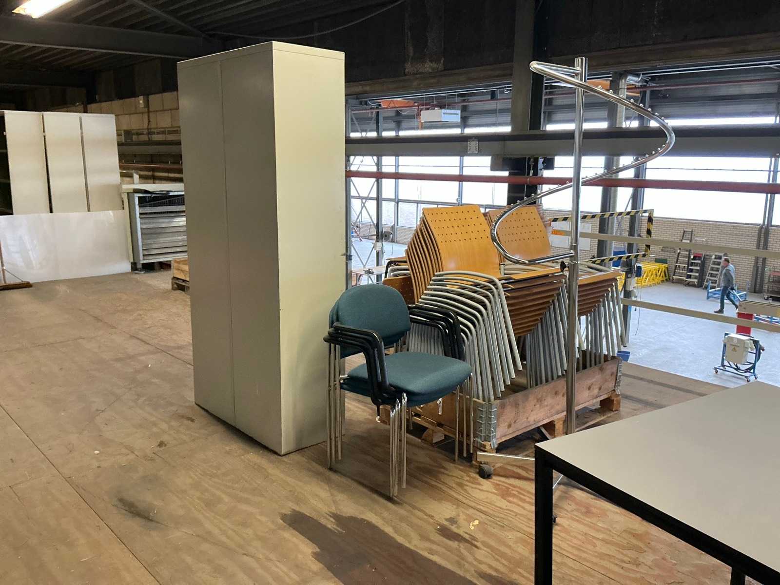 Consisting of 5 filing cabinets, 40 (stackable) chairs, 7 various tables and 1x mobile standing coat rack, on the first floor, there is no elevator Auction-ID: A1-44726-66