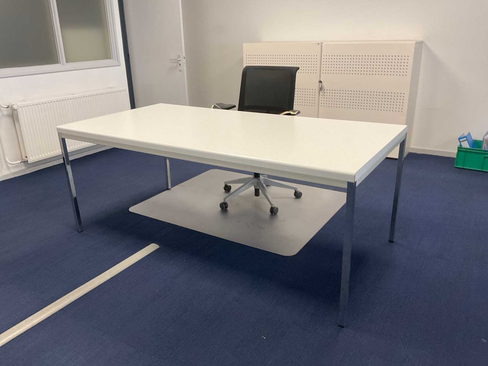Consisting of: (1x) office table 200x100cm, (2x) sliding door cabinet 194x46x120cm, (1x) office table, 200x80cm. (2x) office chairs, (2x) visitor chairs. Auction-ID: A1-44726-84