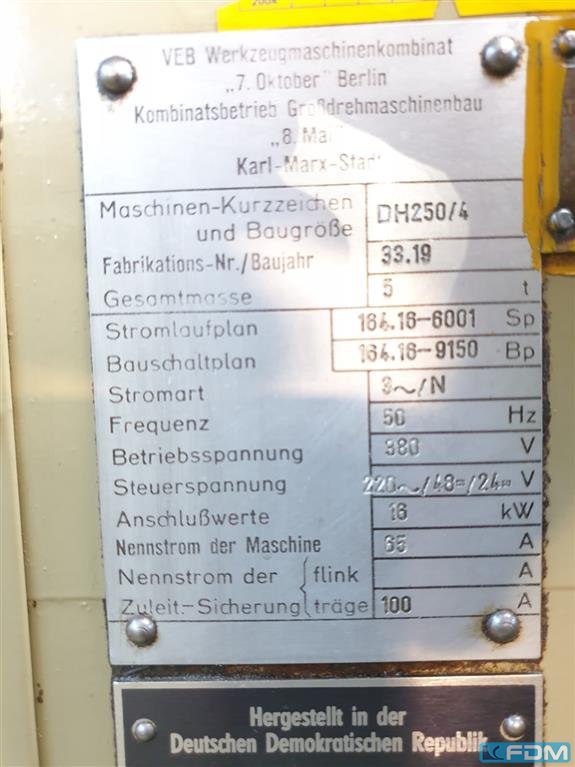 turning length:630 mmtotal power requirement:16 kWweight of the machine ca.:5 tdimensions of the machine ca.:3400 x 1500 x 1600 mmswing diameter over slide rest:Hinterdrehschlitten 250 mmcentre height:über Hinterdrehschlitten 150 mmcenter height over bed:300 mmturning spindle:Kopf DIN 55021 Gr. 8 centre distance:1000 mmaccessories::2 Schränke Wechselräder