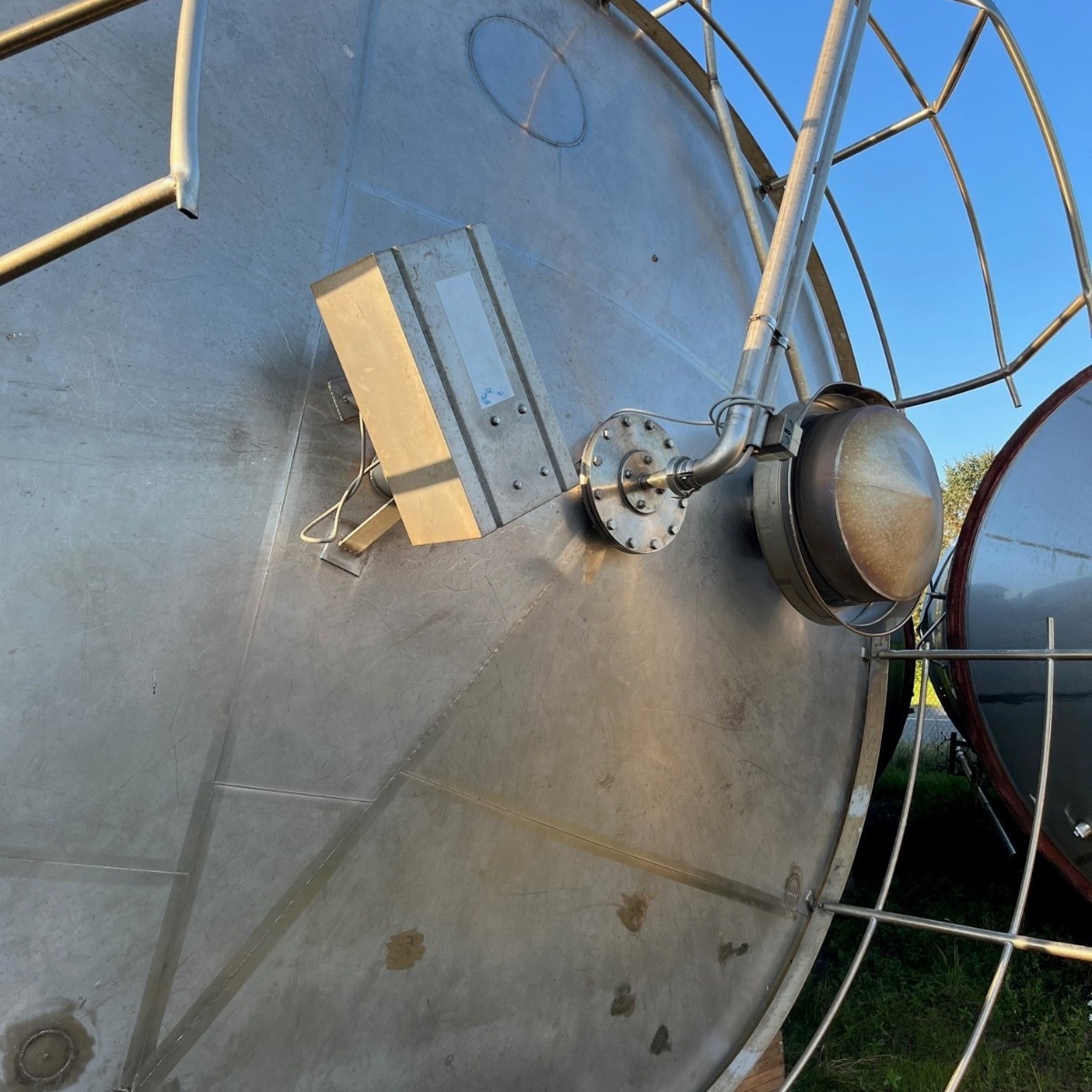 Sewage sludge tank made of stainless steel, with insulation, agitator and side tapping., Additional title: Stainless steel tank with insulation, Capacity: 100000 l, Operating temperature: 80 °C, Material: Stainless steel, Position: Standing on concrete foundation, Base construction: Cylindrical tank with flat bottom, Features: Insulation with stainless steel cladding, feed pump (volume flow 12m3/h); agitator, ladder with back protection, tank top railing,