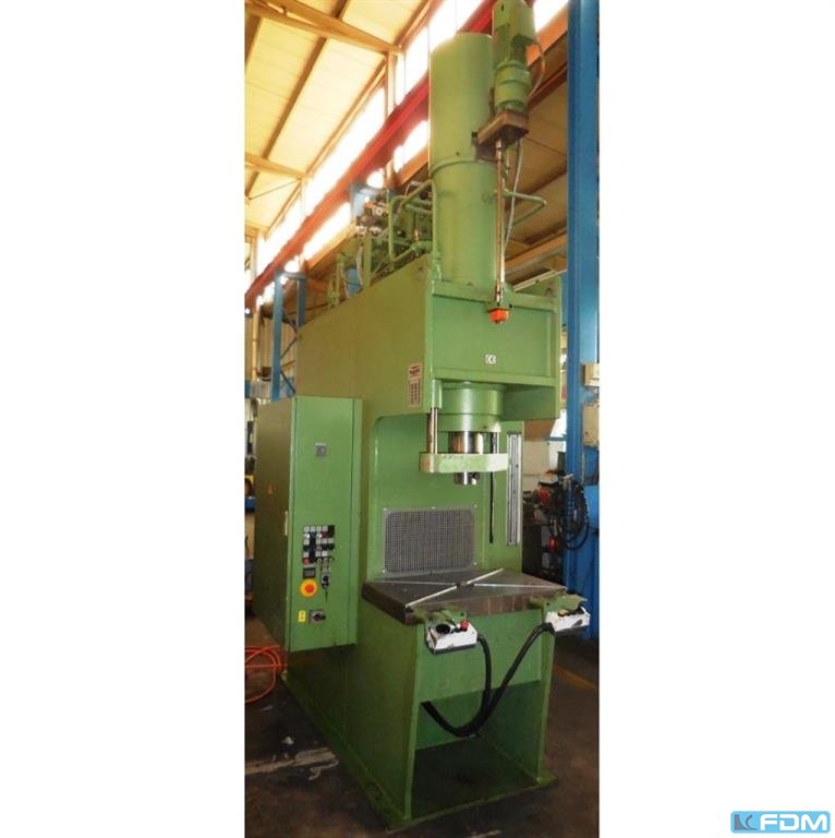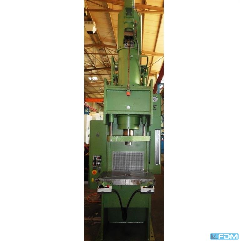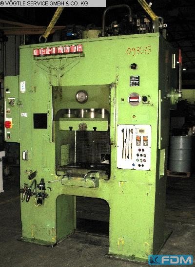 Pressure:40 t throat:330 mm stroke:250 mm distance table/ram, max. stroke up, adjustment up:450 mm table surface area:800 x 500 mm hole in the table:100 mm table height over floor:900 mm ram surface:100 mm Speed down:406 mm/s Speed up:393 mm/s Working speed:14 mm/s oil volume:350 l power requirement:7,5 kW weight:4,6 t dimensions (WxDxH):1,3 x 2,3 x 3,4 m German Safety: permitted for manual loading:CE-sign depth stop:mechanical