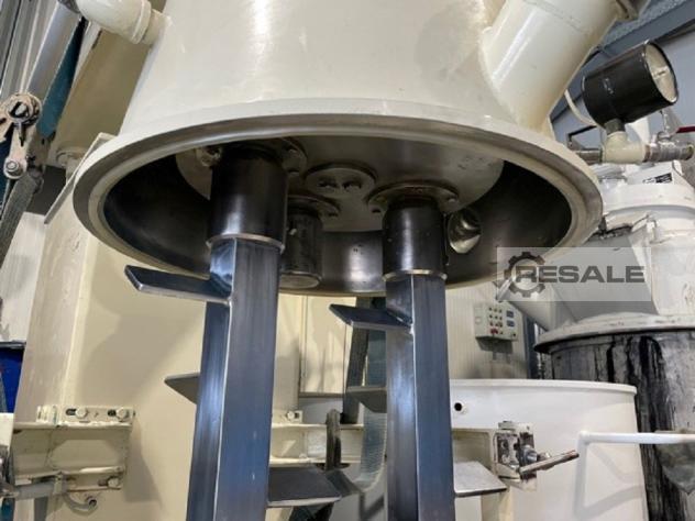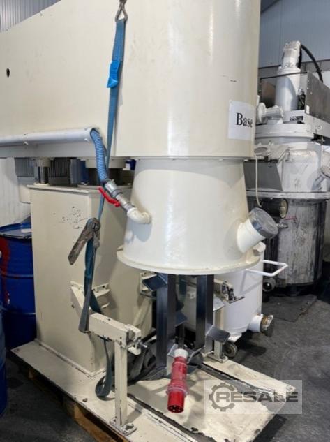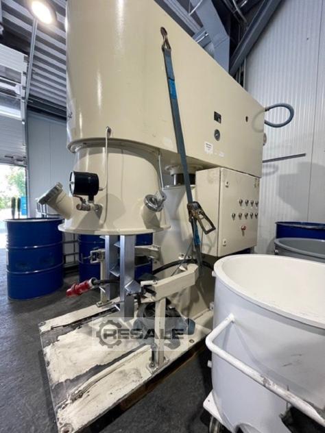 Stock # U2347-3 Used mixer by Netzsch (DE) type VPI 550 with butterfly/tri-foil agitator. Mixer has contact parts designed in stainless steel. Shaft has a working length 650 mm and is equipped with butterfly agitator, with three paddles and external diameter 1080 mm. Agitator is diven by el. motor 48 kW and is hydraulically risen up to about 130 cm. Machine is equipped with local control pane and electric cabinet. Machine is also equipped with hydraulicaly operated post for mixing can. Mixing pan is not included.