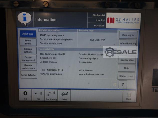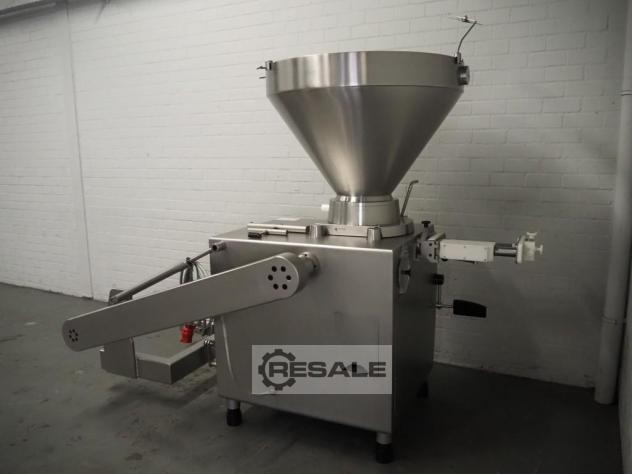 Manufacturer: Rex Model: RVF 761 Condition: Used Serial Number: 7611040927 Stock Number: 3364 Hopper: 250 litres Pump capacity: max. 6100 kg/hr Filling pressure: max. 70 bar Working hours: 19648 Power: 3 x 400V, 50Hz, 15kW Dimensions: 2320 x 1440 x 3035 mm Weight: 1100 kg Filling, portioning and linking Including linker and DHG400 casing holder With lifter for 200 L eurobins