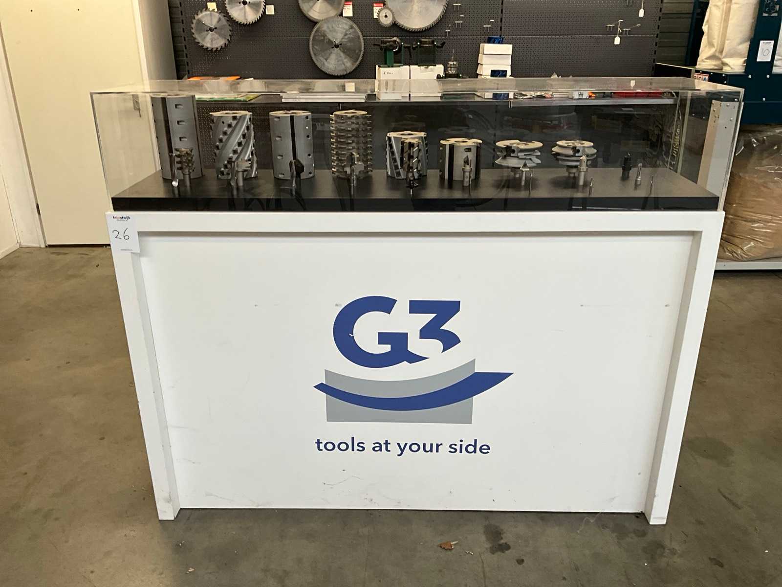 various types and sizes of tools, including saw blade ø 120/250/300/350/400 mm, tool holders, chip guide blocks, drilling tools, all in and with 3 mtr shop rack,